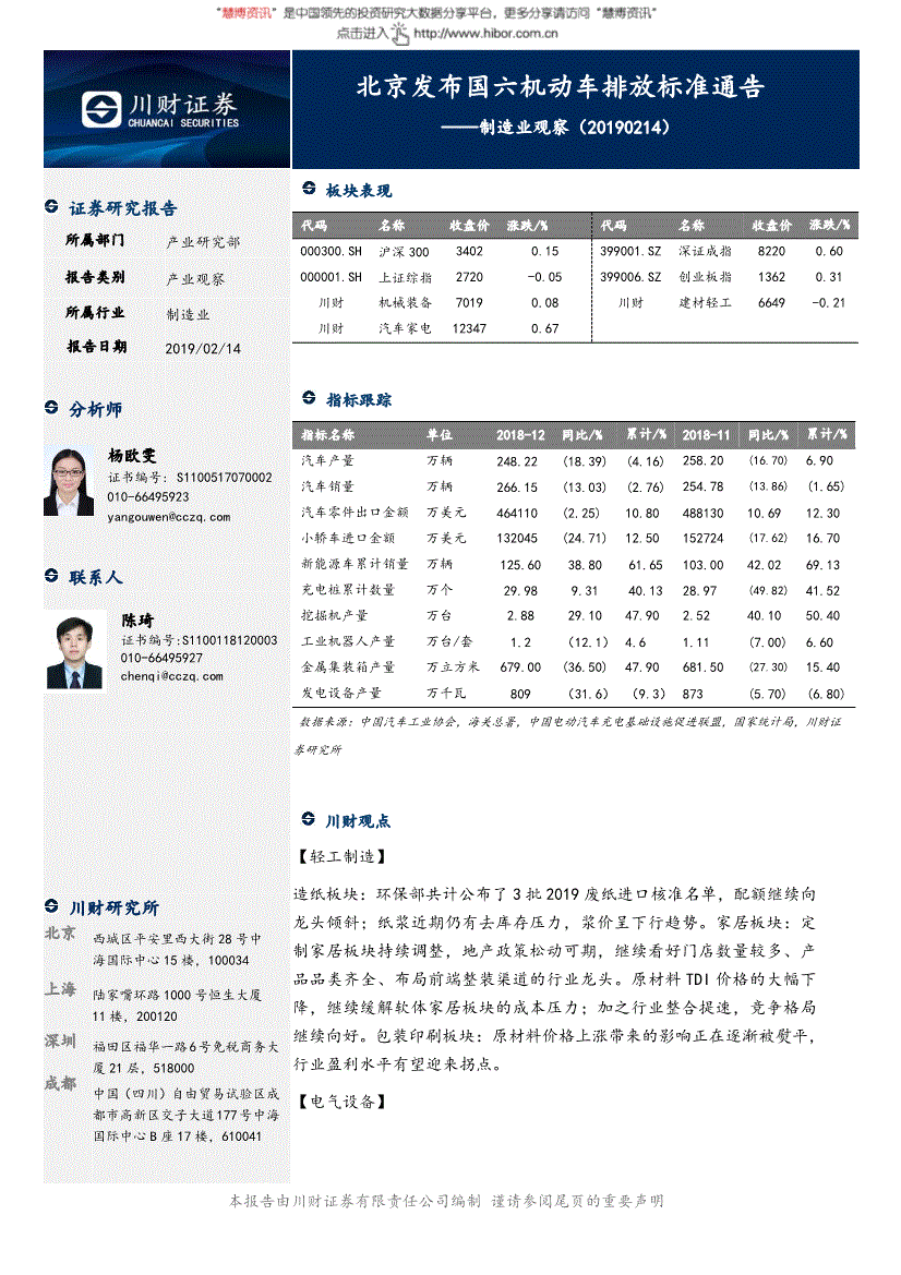 本报告由川财证券有限责任公司编制谨请参阅尾页的重要声明证券研究报告所属部门产业研究部报告类别产业观察所属行业制造业报告日期2019/02/14分析师杨欧雯证书编号: S02 010-66联系人陈琦证书编号:S03 010-川财研究所北京西城区平安里西大街28号中海国际中心15楼,100034上海陆家嘴环路1000号恒生大厦11楼,200120深圳成都福田区福华一路6号免税商务大厦21层,518000中国(四川)自由贸易试验区成都市高新区交子大道177号中海国际中心B座17楼,610041北京发布国六机动车排放标准通告——制造业观察(20190214)板块表现代码名称收盘价涨跌/%代码名称收盘价涨跌/%000300.SH沪深30034020.15399001.SZ深证成指82200.60000001.SH上证综指2720 -0.05399006.SZ创业板指13620.31川财机械装备70190.08川财建材轻工6649 -0.21川财汽车家电123470.67指标跟踪指标名称单位2018-12同比/%累计/% 2018-11同比/%累计/%汽车产量万辆248.22 (18.39) (4.16) 258.20 (16.70) 6.90汽车销量万辆266.15 (13.03) (2.76) 254.78 (13.86) (1.65)汽车零件出口金额万美元464110 (2.25) 10.8048813010.6912.30小轿车进口金额万美元132045 (24.71) 12.50152724 (17.62) 16.70新能源车累计销量万辆125.6038.8061.65103.0042.0269.13充电桩累计数量万个29.989.3140.1328.97 (49.82) 41.52挖掘机产量万台2.8829.1047.902.5240.1050.40工业机器人产量万台/套1.2 (12.1) 4.61.11 (7.00) 6.60金属集装箱产量万立方米679.00 (36.50) 47.90681.50 (27.30) 15.40发电设备产量万千瓦809 (31.6) (9.3) 873 (5.70) (6.80)数据来源:中国汽车工业协会,海关总署,中国电动汽车充电基础设施促进联盟,国家统计局,川财证券研究所川财观点【轻工制造】造纸板块:环保部共计公布了3批2019废纸进口核准名单,配额继续向龙头倾斜;纸浆近期仍有去库存压力,浆价呈下行趋势。